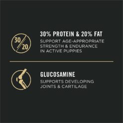 High protein dry dog food with 30 percent protein and 20 percent fat to support age-appropriate strength and endurance in active puppies - Brand Purina Pro Plan