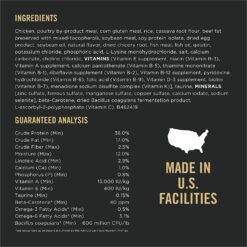 Crude Protein (Min)…38.0%, Crude Fat (Min)…17.0%, Crude Fiber (Max)…2.5%, Moisture (Max)…12.0%, Linoleic Acid (Min)…2.9%, Calcium (Ca) (Min)…1.0%, Phosphorus (P) (Min)…0.8%, Vitamin A (Min)…15,000 IU/kg, Vitamin E (Min)…800 IU/kg, Taurine (Min)…0.15%, Beta Carotene* (Min)…180 ppm, Omega-3 Fatty Acids* (Min)…0.5%, Omega-6 Fatty Acids * (Min)…3.1%. *Not recognized as an essential nutrient by the AAFCO Cat Food Nutrient Profiles.