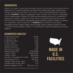 Salmon, Rice, Barley, Canola Meal, Fish Meal (Source Of Glucosamine), Dried Yeast, Beef Fat Preserved With Mixed-tocopherols, Oat Meal, Salmon Meal, Pea Protein, Natural Flavor, Sunflower Oil, Chicory Root Inulin, Fish Oil, Salt, L-lysine Monohydrochloride, Potassium Chloride, Vitamins [Vitamin E Supplement, Niacin (Vitamin B-3), Vitamin A Supplement, Calcium Pantothenate (Vitamin B-5), Thiamine Mononitrate (Vitamin B-1), Vitamin B-12 Supplement, Riboflavin Supplement (Vitamin B-2), Pyridoxine Hydrochloride (Vitamin B-6), Folic Acid (Vitamin B-9), Menadione Sodium Bisulfite Complex (Vitamin K), Vitamin D-3 Supplement, Biotin (Vitamin B-7)], Minerals [Zinc Sulfate, Ferrous Sulfate, Manganese Sulfate, Copper Sulfate, Calcium Iodate, Sodium Selenite], Choline Chloride, L-ascorbyl-2-polyphosphate (Vitamin C), Dried Bacillus Coagulans Fermentation Product. B438719.