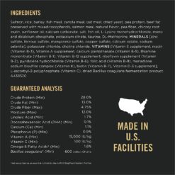 Salmon, Rice, Barley, Fish Meal, Canola Meal, Oat Meal, Dried Yeast, Pea Protein, Beef Fat Preserved With Mixed-Tocopherols, Salmon Meal, Natural Flavor, Pea Fiber, Chicory Root Inulin, Sunflower Oil, Calcium Carbonate, Salt, Fish Oil, L-Lysine Monohydrochloride, Mono And Dicalcium Phosphate, Potassium Citrate, Taurine, DL-Methionine, MINERALS [Zinc Sulfate, Ferrous Sulfate, Manganese Sulfate, Copper Sulfate, Calcium Iodate, Sodium Selenite], Potassium Chloride, Choline Chloride, VITAMINS [Vitamin E Supplement, Niacin (Vitamin B-3), Vitamin A Supplement, Calcium Pantothenate (Vitamin B-5), Thiamine Mononitrate (Vitamin B-1), Vitamin B-12 Supplement, Riboflavin Supplement (Vitamin B-2), Pyridoxine Hydrochloride (Vitamin B-6), Folic Acid (Vitamin B-9), Menadione Sodium Bisulfite Complex (Vitamin K), Biotin (Vitamin B-7), Vitamin D-3 Supplement], L-Ascorbyl-2-Polyphosphate (Vitamin C), Dried Bacillus Coagulans Fermentation Product. A438520