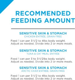 Feed 1 can per 3-1/2 to 4 lbs body weight. Adjust as needed. Divide into 2 or more meals.; Tuna & Oat Meal Entree: Feed 1 can per 3 to 3-1/2 lbs of body weight daily. Adjusted as needed. Divide into 2 or more meals.