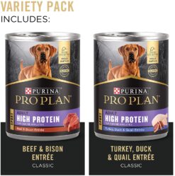Pro Plan Sport High Protein Wet Dog Food Variety Pack delivers two delicious options. So you can surprise his novelty-seeking tastebuds by rotating two satisfying formulas, including Beef and Bison Entrée and Turkey, Duck and Quail Entrée options.