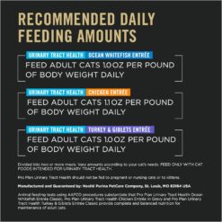 Ocean Whitefish Entree: Feed adult cats 1.0 oz per pound of body weight daily, divided into two or more meals. Vary amounts according to your cat’s needs. FEED ONLY WITH CAT FOODS INTENDED FOR URINARY TRACT HEALTH. Pro Plan Urinary Tract Health Formula should not be fed to pregnant or nursing cats or to kittens.; Chicken Entree: Feed adult cats 1.1 oz per pound of body weight daily, divided into two or more meals. Vary amounts according to your cat’s needs. FEED ONLY WITH CAT FOODS INTENDED FOR URINARY TRACT HEALTH. Pro Plan Urinary Tract Health should not be fed to pregnant or nursing cats or to kittens.; Turkey & Giblets Entree: Feed adult cats 1.0 oz per pound of body weight daily, divided into two or more meals. Vary amounts according to your cat’s needs. FEED ONLY WITH CAT FOODS INTENDED FOR URINARY TRACT HEALTH. Pro Plan Urinary Tract Health should not be fed to pregnant or nursing cats or to kittens.