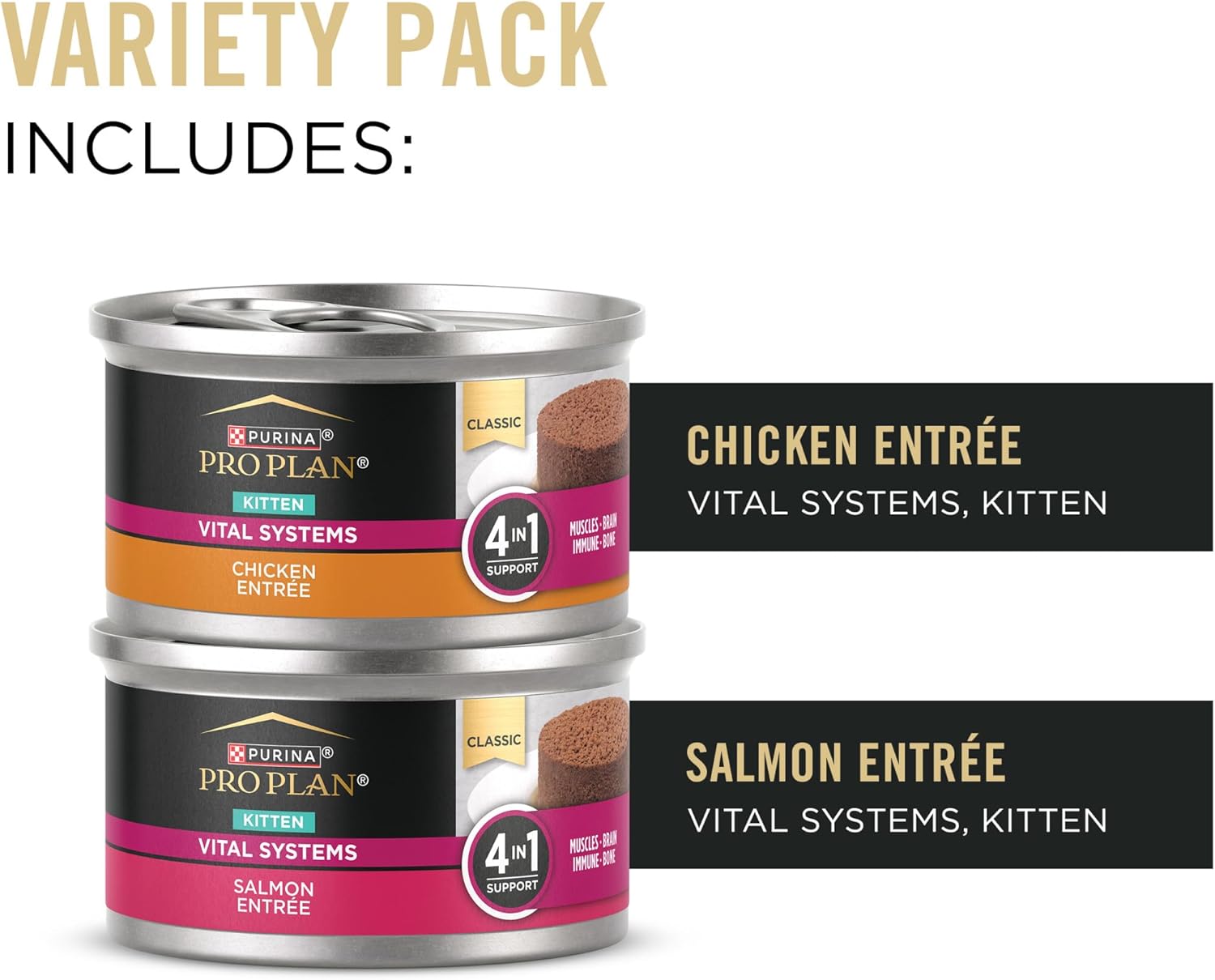Purina Pro Plan Vital Systems Chicken and Salmon Entree Wet Kitten Food Variety Pack 4-in-1 Muscles, Brain, Immune and Bone – (Pack of 24) 3 oz. Cans