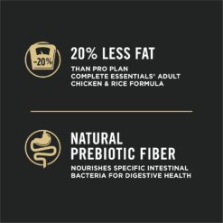- 20 percent less fat than Pro Plan COMPLETE ESSENTIALS Adult Chicken and Rice Formula