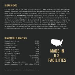 Chicken, Rice, Corn Gluten Meal, Poultry By-product Meal, Wheat Flour, Dried Egg Product, Beef Fat Preserved With Mixed-tocopherols, Soy Protein Concentrate, Natural Flavor, Fish Meal, Inulin, Potassium Chloride, Phosphoric Acid, Calcium Carbonate, Salt, Caramel Color, Choline Chloride, Vitamins [Vitamin E Supplement, Niacin (Vitamin B-3), Vitamin A Supplement, Calcium Pantothenate (Vitamin B-5), Thiamine Mononitrate (Vitamin B-1), Riboflavin Supplement (Vitamin B-2), Vitamin B-12 Supplement, Pyridoxine Hydrochloride (Vitamin B-6), Folic Acid (Vitamin B-9), Vitamin D-3 Supplement, Biotin (Vitamin B-7), Menadione Sodium Bisulfite Complex (Vitamin K)], Taurine, Minerals [Zinc Sulfate, Ferrous Sulfate, Manganese Sulfate, Copper Sulfate, Calcium Iodate, Sodium Selenite], L-lysine Monohydrochloride, Dried Bacillus Coagulans Fermentation Product. L462319