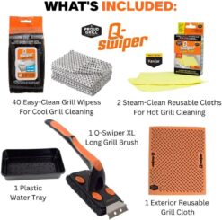 Q-Swiper XL Complete Grill Cleaner Kit – Hot + Cold + Exterior Grill Cleaning. Includes 1 Long Grill Brush, 2 Steam Clean Cloths, 40 Moist Grill Wipes, 1 Exterior Reusable Cloth and 1 Tray.