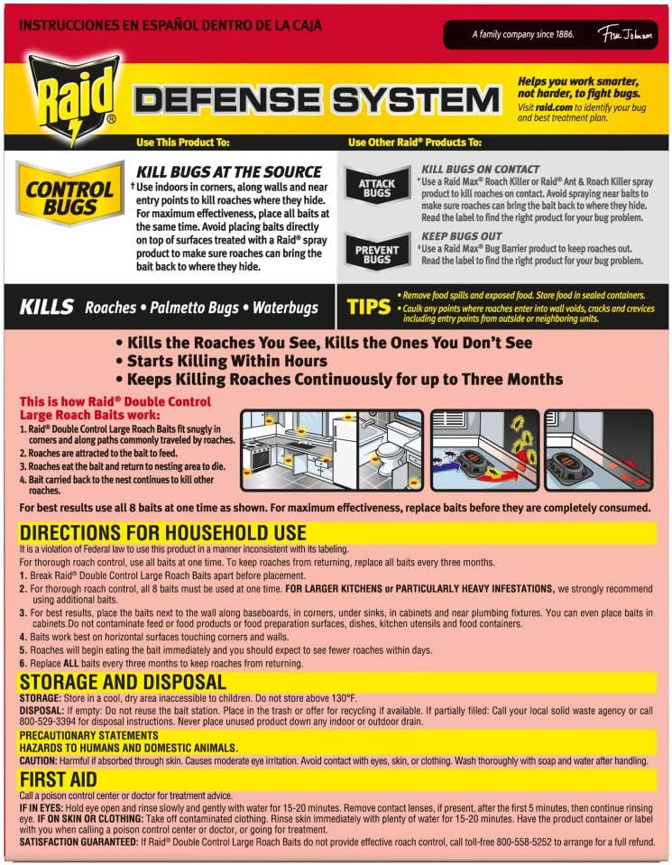 For best results use all 8 baits at one time as shown. For maximum effectiveness, replace baits before they are completely consumed. DIRECTIONS FOR HOUSEHOLD USE: It is a violation of Federal law to use this product in a manner inconsistent with its labeling. For thorough roach control, use all baits at one time. To keep roaches from returning, replace all baits every three months. 1. Break Raid Double Control Large Roach Baits apart before placement. 2. For thorough roach control, all 8 baits must be used at one time. FOR LARGER KITCHENS or PARTICULARLY HEAVY INFESTATIONS, we strongly recommend using additional baits. 3. For best results, place the baits next to the wall along baseboards, in corners, under sinks, in cabinets and near plumbing fixtures. You can even place baits in cabinets. Do not contaminate feed or food products or food preparation surfaces, dishes, kitchen utensils and food containers. 4. Baits work best on horizontal surfaces touching corners and walls. 5. Roaches will begin eating the bait immediately and you should expect to see fewer roaches within days. 6. Replace ALL baits every three months to keep roaches from returning. STORAGE AND DISPOSAL. Storage: Store in a cool, dry area inaccessible to children. Do not store above 130 °F. Disposal: If empty: Do not reuse the bait station. Place in the trash or offer for recycling if available. If partially filled: Call your local solid waste agency or call 800-529-3394 for disposal instructions. Never place unused product down any indoor or outdoor drain.