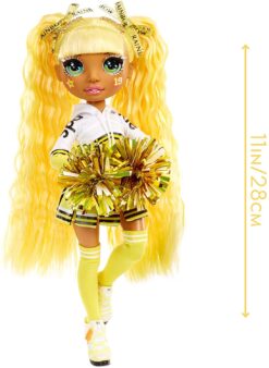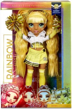 Color, style, looks so fly. We’re the girls of Rainbow High. Collect the Rainbow of school spirit with Rainbow High Cheer fashion dolls. Sunny Madison got a cheerleading makeover in a gorgeous yellow cheerleader outfit that reflects her bright, happy style. She has gorgeous features, long eyelashes and beautiful, brushable hair in cute pigtails. Her hair also features doll accessories like bows and barrettes.