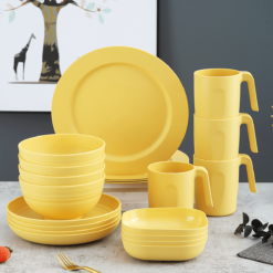 ReaNea Plastic Dinnerware Set of 20 Pieces, Unbreakable And Reusable Light Weight Plates Mugs Bowls Dishes Easy to Carry And Clean Microwave Safe BPA Free Dishwasher Safe Service For 4 (Gold Yellow) The ReaNea Plastic product are made of food safe grade material, They are BPA free. Perfect for daily use, camping, travel, pinic, farm work. They are light weight, unbreakable and easy to carry. It is a perfect gift for friends, mother, workmate, children.