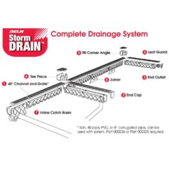 Eliminating outdoor runoff water which can cause flooding and pooling around a property is quick and easy with the RELN Storm Drain Channel system. Storm Drain Channels are available in 40 in. and 10 ft. lengths, with interlocking sections that snap-in together to create the desired length that suits your project. The systems design allows maximum flexibility with, corners and intersections. The “U” shaped channels aid in self-cleaning with a deep profile. You can connect Storm Drain to 4 in. sewer pipe with the end outlet, Inline pit and to prevent leaves or other debris clogging pipes or waterways with the Leaf Guard. The tough durable and lightweight UV stabilized plastic channel includes pressed metal grate to suit domestic pedestrian and vehicle traffic.