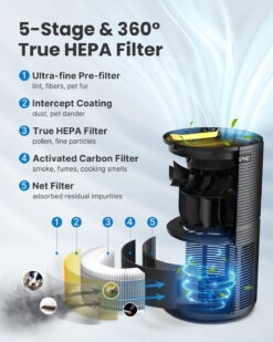 - H13 True HEPA Filter & Advanced 5-Stage Filtration System: Medical grade H13 Filters (higher rated than True HEPA) effectively removes 99.97% of fine particles as small as 0. 3 microns and large pollutants such as odor, dust, pet dander, smoke. H13 True HEPA is considered medical-grade air filtration, the unit alone is not a medical device. The 360° sleek tower design uses advanced 5-stage filtration with a long-life HEPA filter.