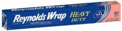 Reynolds Wrap Aluminum Foil, Heavy Duty, 50 sq ft,(2 pack). Reynolds Wrap Heavy Duty Aluminum Foil stands up to the demands of extra-high heat and is perfect for cooking tasks that need top-quality performance. Made in the USA, Reynolds Wrap Heavy Duty Aluminum Foil has superior strength you can count on for cooking delicious meals with easy cleanup. Use this heavy duty foil wrap to lock in flavor with foil packets that keep food moist, wrap and store leftovers in the freezer or refrigerator, and prevent messy splatters by covering pans in the oven or on the stovetop.