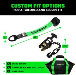 - THE COMPLETE TIE DOWN KIT – (4) 2 Inch x 96 Inch Lasso Straps, (4) T-Handle Ratchet Straps, Heavy Duty Oversized Storage Bag & Velcro for Securing Excess Strap