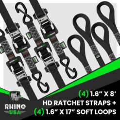 Rhino USA Ratchet Straps Heavy Duty Kit (4-Pack) – 1.6 Inch x 8 Feet (5,208lb Break Strength) – Ultimate Tie Down Straps with Safety S Hooks for Trucks, ATV, UTV, Motorcycle, Cargo & More – Black
