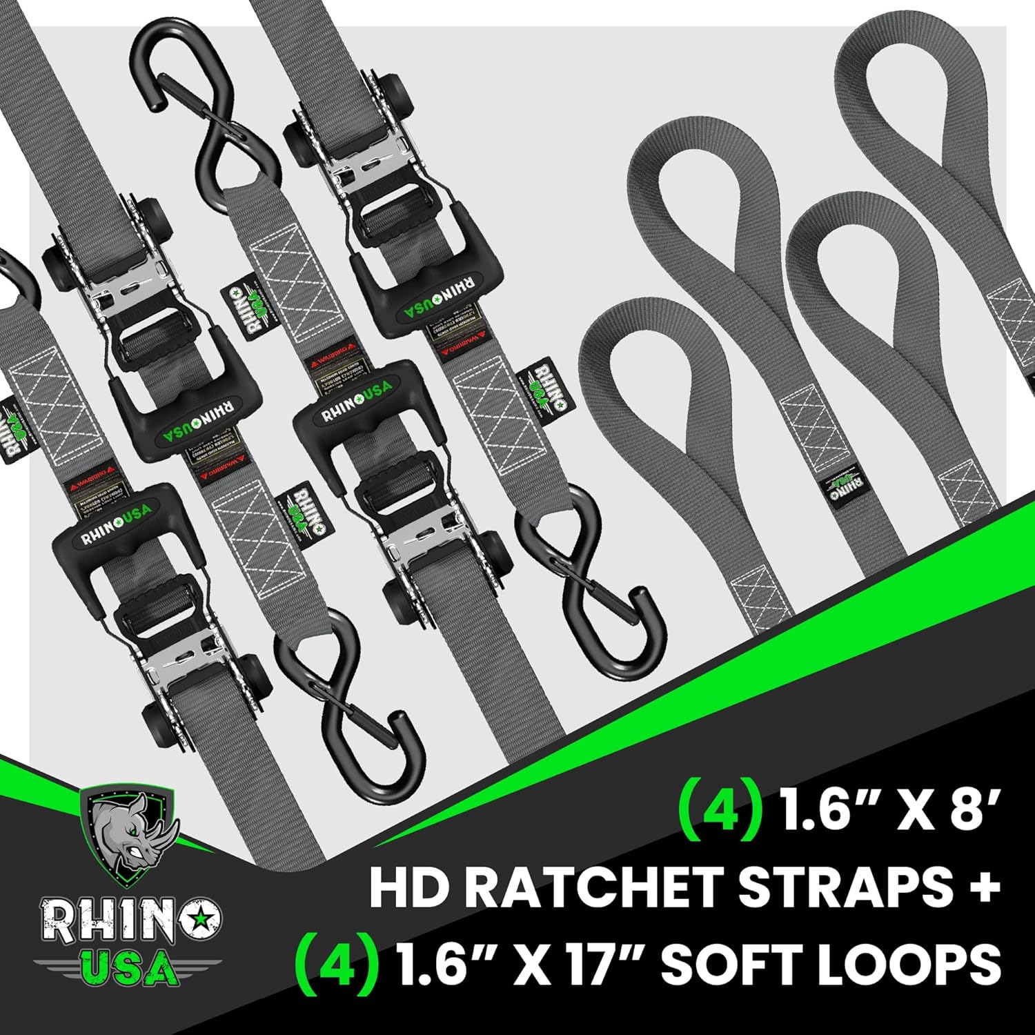 Rhino USA Ratchet Straps Heavy Duty Kit (4-Pack) – 1.6 Inch x 8 Feet (5,208lb Break Strength) – Ultimate Tie Down Straps with Safety S Hooks for Trucks, ATV, UTV, Motorcycle, Cargo & More – Gray