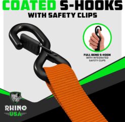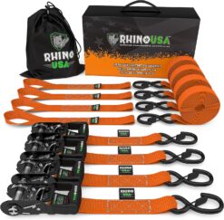 Rhino USA Ratchet Straps Heavy Duty Kit (4-Pack) – 1.6 Inch x 8 Feet (5,208lb Break Strength) – Ultimate Tie Down Straps with Safety S Hooks for Trucks, ATV, UTV, Motorcycle, Cargo & More – Orange