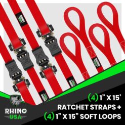 Rhino USA Ratchet Straps Tie Downs (4-Pack) – 1 Inch x 15 Feet (1,823lb Break Strength) – Ultimate Tie Down Straps with Safety S Hooks – for Trucks, Cargo, Moving, Appliances – Red