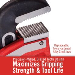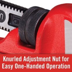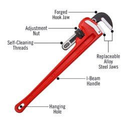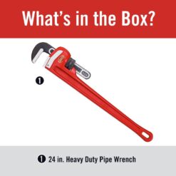 Experience strength and durability with a wrench unlike any other, the 24 in. RIDGID Heavy-Duty Straight Pipe Wrench (catalog number 31030, Model 24). Built to perform in the harshest jobsite conditions, this 24 in. straight pipe wrench accommodates all forms of pipe work with strength and accuracy with a pipe capacity of 3 in. The full-floating forged alloy steel hook jaws provide maximum gripping power and quick ratcheting action during pipe adjustment jobs. Designed for ease of operation, the wrench features convenient self-cleaning threads as well as easily and quickly replaceable hook jaws, heel jaws, and spring assemblies. Constructed with ductile-iron housing and an easy to hold I-beam handle, it provides long-lasting strength and durability that can withstand heavy-duty and long-term use. This standout red-colored wrench is easy to locate in your toolbox and complies with GGG-W65IE, Type II, and Class A federal specifications.