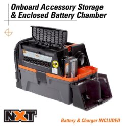 - Shop vac features onboard battery compartment, accessory storage, and hose storage