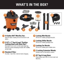 - Includes RIDGID 12 Gallon 5.0 Peak Horsepower NXT Wet/Dry Shop Vacuum featuring an additional hose that is 20 ft. long – best for tough, moderate-sized wet or dry cleanups