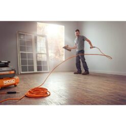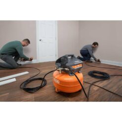 RIDGID introduces the 6 Gal. Portable Electric Pancake Air Compressor with 1/4 in. 50 ft. Lay Flat Air Hose. This powerful compressor is perfect for trim and finish work with 150 PSI. Work with multiple people on the jobsite with dual universal quick connectors and use 2 nailers at once. Equipped with a Best-in-Class oil-free pump for reliable, maintenance-free performance, this compressor has everything you need to get the job done. Backed by the RIDGID 3-Year Manufacturer’s Warranty, this compressor includes an electric cord and an operator’s manual. The RIDGID Lay Flat Hose has a unique lay flat design that allows it to keep its shape, is kink resistant, is non-tangling. At just over 3 lbs. for a 50 ft. hose, its lightweight design makes it easier for you to maneuver around your work space. Heavy-duty 360° swivel fittings with bend restrictors make the usual weakest point on of this hoses strengths. The durability of the bend restrictors provides extra-support to increase the life of the hose. Unlike other hoses, the Lay Flat hose is able to flex in cold weather, which allows you to keep working regardless of your climate. It’s 100% field repairable which saves you time and money in case of an accidental tear. With a 300 maximum PSI capacity, the RIDGID Lay flat Hose can be used for heavy-duty applications. The 1/4 in. 50 ft. Lay Flat Air Hose is warranted against defective parts and labor, and includes 360° swivel fittings.
