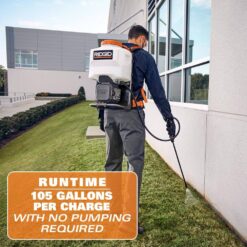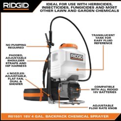 - Includes: R01501 4 Gal. backpack chemical sprayer, R87002 18-Volt 2.0Ah battery, charger, adjustable nozzle, flat fan nozzle, dual nozzle, and shower nozzle