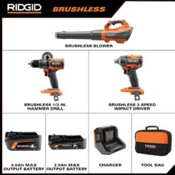 - Includes: R01601 Brushless Blower, (1) R86115 Brushless 1/2 in. Hammer Drill/Driver, (1) R862311 Brushless 3-Speed 1/4 in. Impact Driver,(1) R840020 2.0 Ah MAX Output Battery, (1) R840040 4.0 Ah MAX Output Battery, (1) R86093 Charger, and Tool Bag