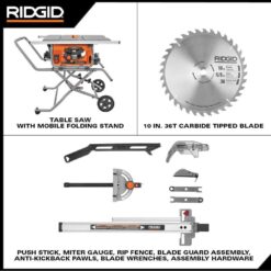 - Includes: Table Saw, Push Stick, Blade Guard Assembly, Table Saw Utility Vehicle, Assembly Hardware, Carbide Tipped Blade, Rip Fence, Miter Gauge, Blade Wrenches, Riving Knife, Anti-kickback Pawls, and Operators Manual