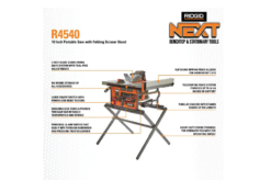 The compact design of the R4540 table saw is perfect for contractors or home owners needing a quality table saw in a small package. 15 Amp power and a precise telescoping rail and fence system make it easy to keep the fence square for any cut. 25 in. right rip capacity makes cutting sheet stock a snap. The scissor style stand and tubular chassis with extra blade resist tipping even cutting large stock.