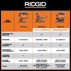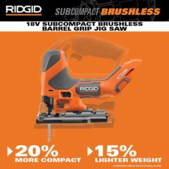 RIDGID introduces the 18V SubCompact Brushless Cordless Barrel Grip Jig Saw Kit with 18V 4.0Ah MAX Output Battery and Rapid Charger. RIDGID’s SubCompact Brushless lineup pairs powerful brushless motor technology in a compact tool design. This SubCompact Brushless Barrel Grip Jig Saw delivers powerful, controlled cutting with speeds up to 3,200 SPM, and cuts up to 150 linear feet with a 4.0Ah MAX Output battery. It’s 20% more compact and 15% lighter weight than the full-size brushless unit. The enhanced ergonomic design provides users with superior maneuverability. This jig saw also features a 7-mode speed selector that includes a load-sensing auto mode that provides ultimate user control. It also features a one touch blade insert/eject, a bevel max bevel capacity of 45°, and 4 orbital settings for aggressive wood cutting. Users can maintain a clean line of sight with the unit’s dust blowing capability and LED light. As always, this RIDGID 18V SubCompact Brushless Jig Saw is 100% compatible with all RIDGID 18V batteries. Best of all, this tool is eligible for the Industry’s Best Lifetime Service Agreement, simply register within 90 days of purchase for FREE Batteries, FREE Parts, FREE Service, FOR LIFE. The R86346 includes the 18V SubCompact Brushless Barrel Grip Jig Saw, vacuum attachment, t-shank wood cutting blade, 4.0 Ah MAX Output Battery, and Rapid Charger.