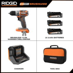 RIDGID R8711K-AC8400802 18V SubCompact Brushless 1/2 In. Hammer Drill/Driver Kit with (1) 2.0 Ah Battery, Charger, Bag, and Extra 2.0 Ah Battery