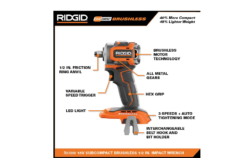 What a great size for this Subcompact Impact wrench is. I wish I had it a few months ago when I was trying to get a nut off an old bolt on my truck and did not have enough room to use my regular size impact wrench. This Subcompact would have been perfect. I like the numerous features: 3 speeds, Brushless motor, LED Light and all metal gears. Also don’t forget the benefits of the Lifetime Service Agreement as well as any Ridgid 18v battery will work with this tool. I show the tool without a battery as this kit Model #R87208B is tool only, wish it also came with a battery as I like to have one for every tool and batteries seem to be more cost effective when they are packaged with a tool.