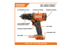 Drill/Driver: 15% lighter weight for enhanced user comfort when compared to R8600521 RIDGID 18V Drill/Driver - Drill/Driver: 20% faster drilling to complete the job quicker when compared to R8600521 RIDGID 18V Drill/Driver