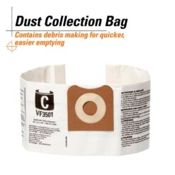 - Pair your dust bag with a shop vac filter for dry pickup and to help optimize vacuum performance – Use the RIDGID VF3400 general debris filter (sold separately) for general dust and dirt, the VF3500 fine dust filter (sold separately) for fine powders and mold, the VF3600 HEPA material filter (sold separately) for drywall dust, and the VF3800 HEPA filter (sold separately) that is 99.97% efficient at filtering dry particles 0.3 micron or larger