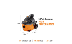 Take on projects confidently with the 4 Gallon Portable Wet/Dry Shop Vacuum featuring a specialized RIDGID shop vac accessory kit for different cleaning applications. The RIDGID attachments (Dual-Flex hose, utility nozzle, car nozzle and extension wands) included with this compact 4 gallon RIDGID wet/dry vac provides a more customized and efficient cleanup. The 3 extension wands extend the overall reach for hard-to-get-to places, the locking hose with Dual-Flex offers uninterrupted cleaning through its unique locking technology and the utility nozzle is perfect for cleaning up large areas. When you need more intricate cleaning options for smaller areas, the car nozzle will do the job. The included 4 gallon RIDGID shop vac is a small, lightweight vac that packs a punch with amped-up power and performance on the inside and a modern look on the outside. This vac has a 5.0 peak HP motor that can tackle even the messiest projects. The vac has large rear wheels and casters that provides great mobility over carpeted floors, thresholds, and rough floors at jobsites. This is an ideal vacuum for car cleaning and in-home tasks. Pro Tip: Add a RIDGID filter (VF3500 – sold separately) to a RIDGID shop vac to maintain the power of the vac and extend vacuum life. Add a RIDGID dust bag (VF3501 – sold separately) to the shop vacuum to help keep the wet/dry vac drum clean and for quick pickups.