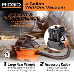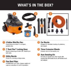 Take on projects confidently with the 4 Gallon Portable Wet/Dry Shop Vacuum featuring attachments, a fine dust filter and the RIDGID premium car cleaning kit. The RIDGID attachments (Dual-Flex hose, utility nozzle, car nozzle and extension wands) included with this compact 4 gallon RIDGID wet/dry vac provides a more customized and efficient cleanup. The 3 extension wands extend the overall reach, the locking hose with Dual-Flex offers uninterrupted cleaning and the utility nozzle is perfect for cleaning up large areas. This vac also includes an auto cleaning kit for vehicle detailing which includes pro-grade hose, claw nozzle, slim crevice tool, soft bristle brush and stiff bristle brush with adapter. When you need more intricate cleaning options for smaller areas, the car nozzle will do the job. The included 4 gallon RIDGID shop vac is a small, lightweight vac that packs a punch with amped-up power and performance on the inside and a modern look on the outside. This vac has a 5.0 peak horsepower motor that can tackle even the messiest projects. The large rear wheels and casters provide great mobility over carpeted floors, thresholds, and rough floors at jobsites. This is an ideal vacuum for car cleaning and in-home tasks. Pro Tip: Add a RIDGID filter (sold separately) to a RIDGID shop vac to maintain the power of the vac and extend vacuum life. Add a RIDGID dust bag (VF3501 – sold separately) to the shop vacuum to help keep drum clean and for quick pickups.