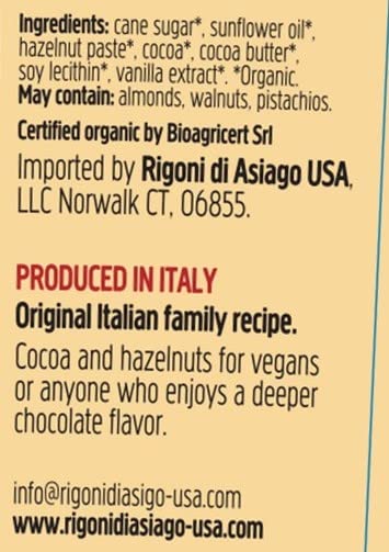All organic ingredients – Cane sugar, Sunflower oil, Hazelnut paste 18.3%, Cocoa powder 10.4%, Cocoa butter, Soy Lecithin, Vanilla extract