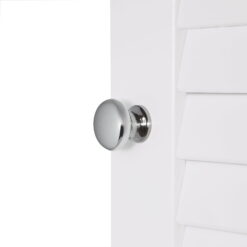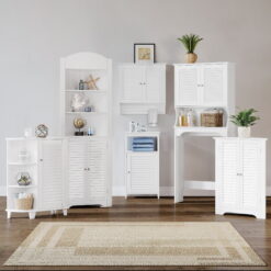 The upper half of the RiverRidge Home Ellsworth collection-tall cabinet includes three open shelves perfect for displaying decorative accents. The lower half includes one interior adjustable shelf hidden behind double doors to house a variety of bathroom essentials. Additional dimensions: Fixed upper shelves: 15.25″ L x 19.25″ W x 10.625″ D, interior middle/bottom shelf: 15.25″ L x 20.75″ W x 10.625″ D, and space between fixed shelves: 9.25″-9.75″.