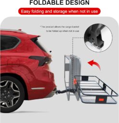 - FOLDING DESIGN: The receiver hitch cargo rack includes a folding tilt shank, which lets you fold up the cargo rack when not in use. The angled shank offers increased ground clearance, making this cargo hitch carrier versatile for various vehicle types.