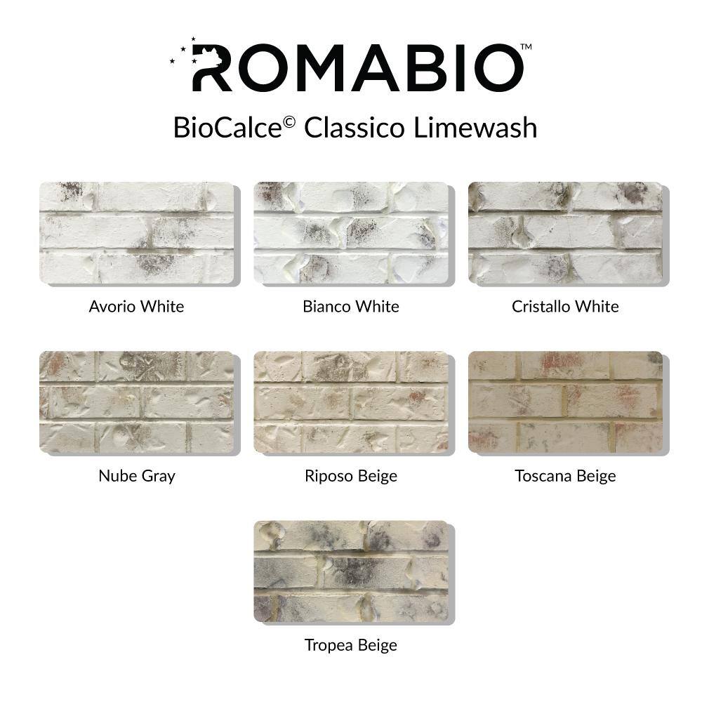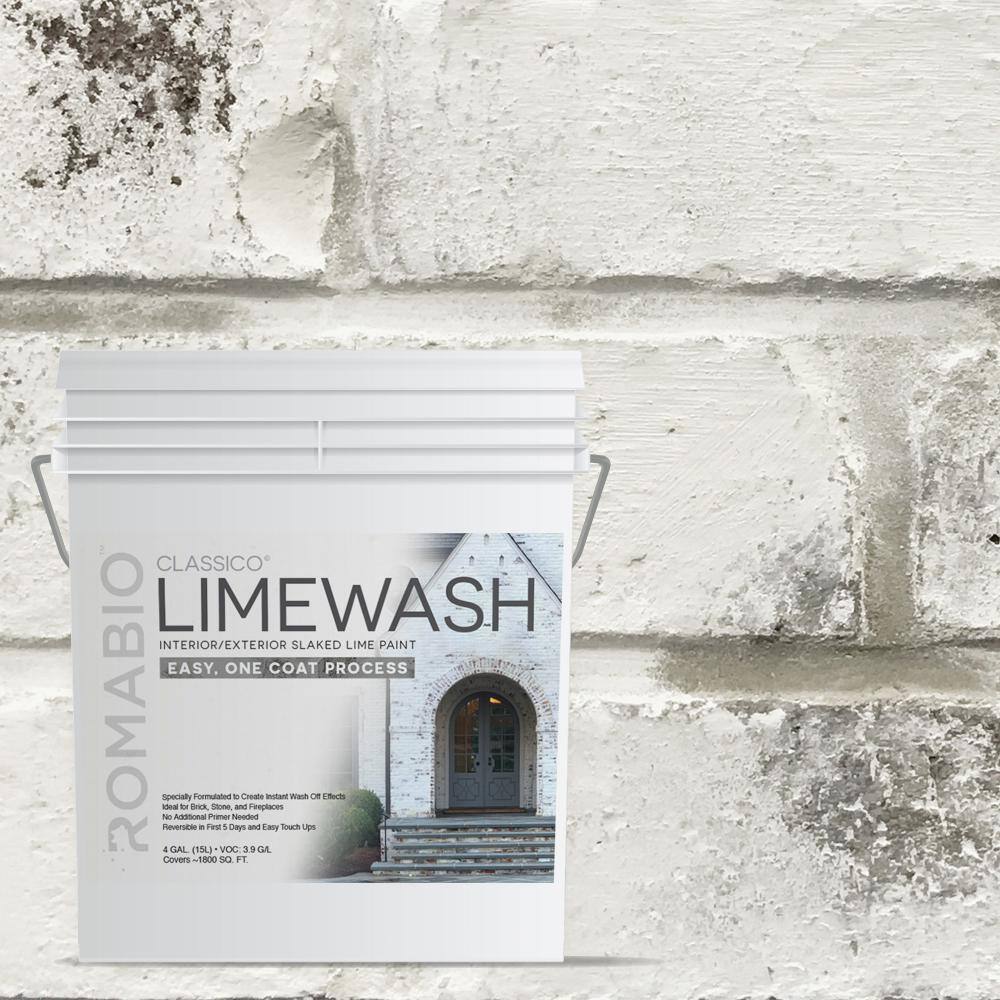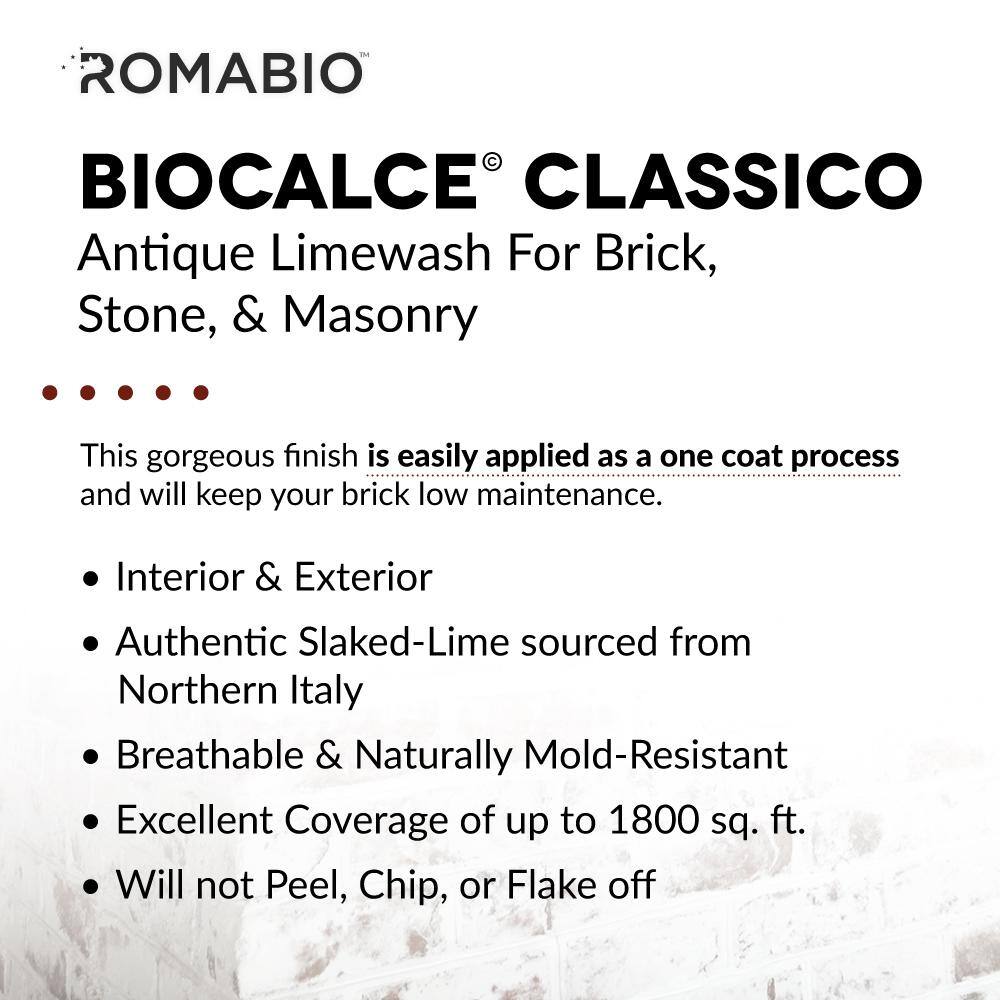 Romabio Classico Limewash is an authentic, slaked-lime paint that is specially formulated to create unique white wash effects for Interior and Exterior unpainted brick, stone and other masonry surfaces. This Limewash paint is easily applied as a 1-coat process to a damp surface and is washed off with a garden hose or spray water bottle to create an antique lime wash finish equal to the look in historic Europe. Unlike German Schmear technique using mortar, this paint is breathable, high UV-resistant, and will continue to calcify and harden over the years and will not peel or chip off as it is designed for durability for the exterior.
