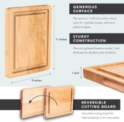 - Versatile Features: Each board boasts a juice groove that holds 2-4 oz of liquid (size-dependent), has a reversible design and convenient carrying handles. The largest size has three divided wells for organized food prep.