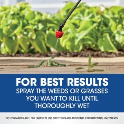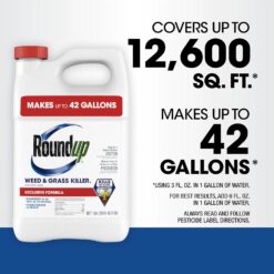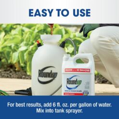 Take control of your outdoor space with Roundup® Weed & Grass Killer₄ Concentrate. It kills tough weeds and grasses to the root, including dandelion, large crabgrass, poison ivy, clover (red & white), spotted spurge, and other broadleaf weeds. It is rainproof in as fast as 30 minutes, produces visible results in hours, and allows you to plant 1 to 30 days after application (see booklet for details). Use Roundup® Weed & Grass Killer₄ Concentrate in flower beds, around trees, along fences, driveways and walkways, freshly cut woody stumps, in large areas for lawn replacement, garden plot preparation and other areas of your yard. Mix the concentrate according to label directions and spot treat or spray evenly each gallon of spray solution over 300 sq. ft. with a tank or hose-end sprayer. Do not allow people or pets to enter the treated area or touch treated plants until spray has dried. One 1 gal. bottle of Roundup® Weed & Grass Killer₄ Concentrate makes between 21 to 42 gallons (see booklet for mixing instructions) and covers up to 6,300 to 12,600 sq. ft.