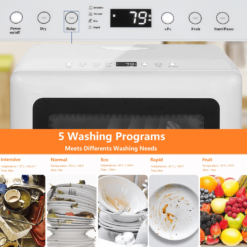 5 Washing Programs-Meets different needs Intensive Mode– Temperature : 72°C / 161.6°F — Time: 99 minutes Normal Mode– Temperature : 70°C / 158°F — Time 79 minutes ECO Mode– Temperature : 65°C / 149°F — Time : 139 minutes Rapid Mode– Temperature : 65°C / 149°F — Time 29 minutes Fruit Mode– Temperature : 35°C / 95°F — Time : 18 minutes