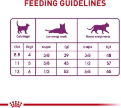 Special Formula Recommended Feeding Guide: When changing your pet’s diet, gradually mix food over a five to seven day period, increasing daily the amount of new food added so that 100% of the new food will be provided to the pet by day seven. Food may be served right out of the bag or moistened with water, if desired. You may wish to leave a daily portion of dry cat food out and available at all times so that cats may feed themselves. Always remember to provide your pet with clean, fresh water at all times. For your pet’s health, see your veterinarian regularly. This is only a guide. Optimal feeding amounts may vary with age, temperament, activity level and environment. 4 to 7 pounds underweight feed 1/4 to 1/2 cup per day, ideal weight feed 1/4 to 1/3 cup per day, 7 to 11 pounds underweight feed 1/2 to 2/3 cup per day, ideal weight feed 1/3 to 1/2 cup per day, overweight feed 1/4 to 1/2 cup per day, 11 to 15 pounds underweight feed 2/3 to 1 cup per day, ideal weight feed 1/2 to 3/4 cup per day, overweight feed 1/3 to 2/3 cup per day. cup = 8 fluid ounces = 111 grams. cup = standard 8 oz measuring cup.