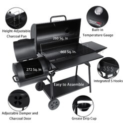 Prepare a substantial number of delicious gourmet meals for your family and friends with this Royal Gourmet CC2036F charcoal grill with offset smoker. A compact design and versatile appliance can fit on most patios, balconies, and decks with ease. Besides, the most attractive feature is the seamless combination of the main charcoal grill and offset smoker. Not only is it good for delivering a smoky flavor, but also it allows roasting side dishes like corn or vegetables for vegetarians. Enjoy the combination of grilling and smoking with Royal Gourmet.