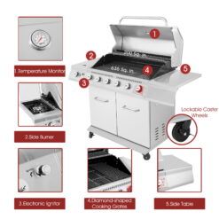 - 4. Precise Heat Control: Simply press the electronic ignitor button to spark up burners instantly while turning the control knobs to the highest position, adjust the grilling temperature to sear, roast or cook slowly with the monitor of integrated gauge.
