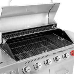 - 6. Cooking Versatility: Diamond-shaped cast iron cooking grates are specially designed for scorching and sizzling steaks with sear burner; lidded side burner is ideal for cooking side dishes and sauces; powerful rear burner is perfect for rotisserie chicken.