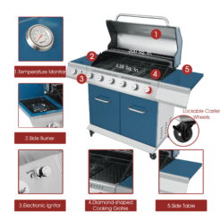 Searing steaks or cooking vegetables, melting cheese or smoking salmon, what sort of BBQ tools will help you to get perfect flavors? The resounding answer to that question is our Royal Gourmet® GA6402B 6-Burner BBQ Liquid Propane Gas Grill. Whether you are going to hold a large party to entertain friends or just have a free time barbecue at will with families, it will shine when you are grilling. Not merely multi-functional, it has a modern design with a blue porcelain-enameled appearance. Make Royal Gourmet® be your intimate cooperator, you will achieve outstanding grill performance as you like.