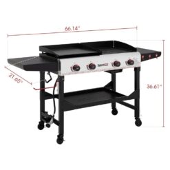 Grill or griddle Do what you want. This multi-functional Royal Gourmet GD403 Gas Grill and Griddle Combo exemplifies our ideal of beauty and practicality. Compact and simple cart style creates a distinguished appearance in the daily gatherings. with 2 individual cooking zones, you will get different grilling experiences that allow you to have enough cooking versatility like sauteing, scrambling, stir-frying, searing, sizzling and smashing. Come together with this ultimate combo grill. Let’s deliver Royal Gourmet in the coming grilling season.